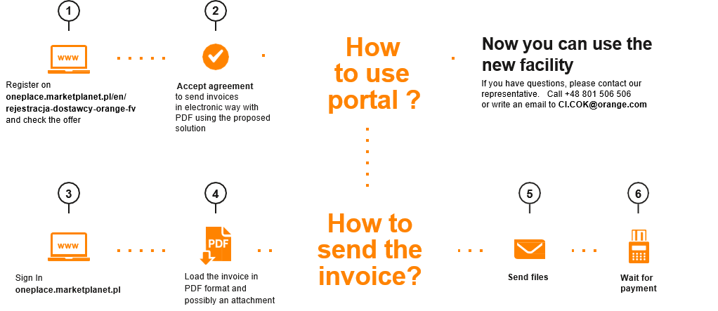 Based on Article. 106n of the Act of 11.03.2004 on tax on goods and services (i.e. Dz. U. of 2011, No. 177, item 1054, as amended) Orange Polska Spółka Akcyjna, ul. Al. Jerozolimskie 160, 02-326 WARSAW; NIP 526-02-50-995 accepts sending invoices, their credit notes and duplicates in the PDF form via this portal.